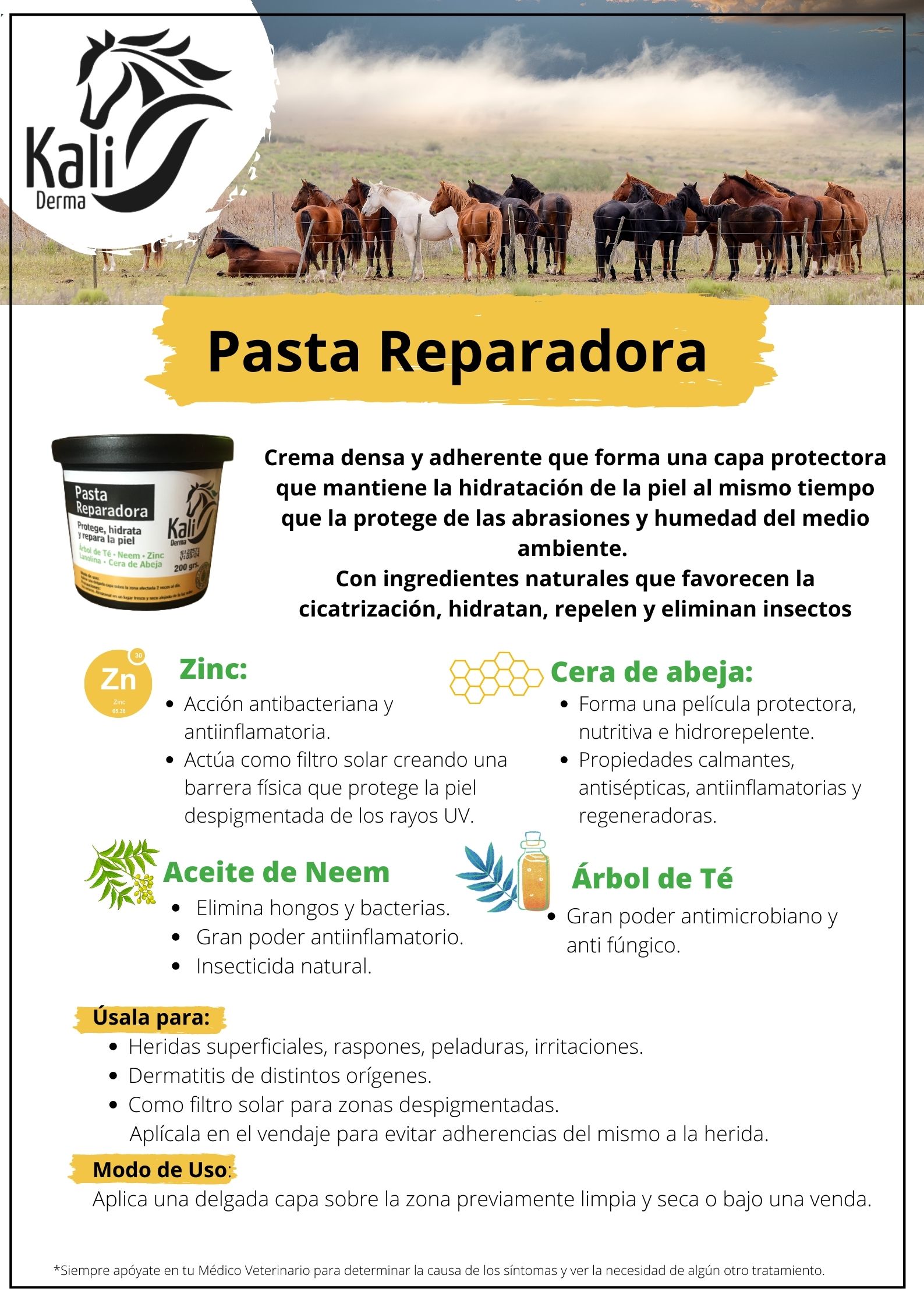 Nuestra Pasta Reparadora está formulada con Aceite de Neem, Árbol de Té, Óxido de Zinc y Cera de Abeja, combinando acción antibacteriana, antiinflamatoria y cicatrizante con una barrera protectora densa y adherente que resiste el polvo, la humedad y el pastoreo.